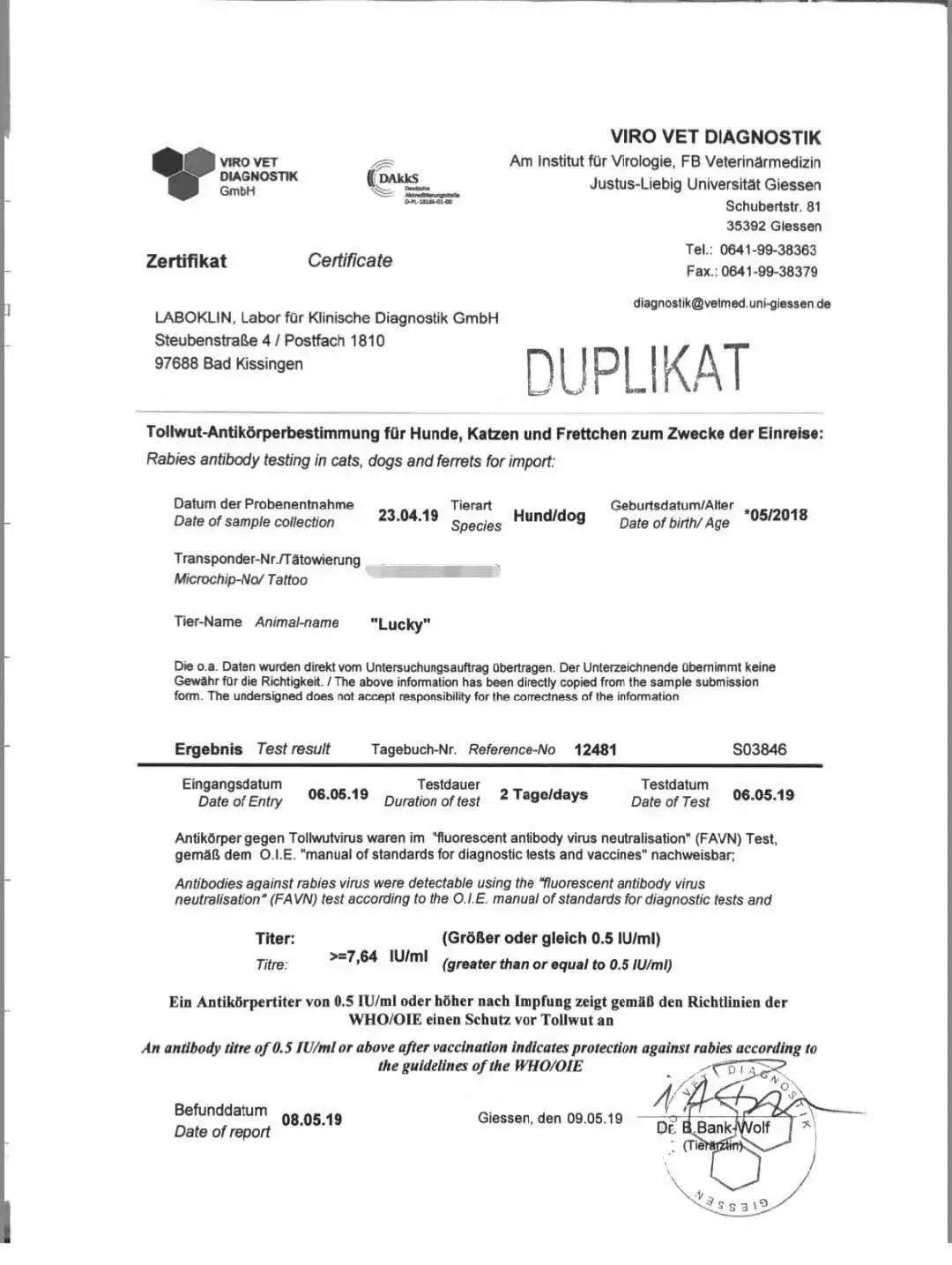相關(guān)國家或地區(qū)要求狂犬病抗體檢測的,要去對方國家認可的實驗室(具體咨詢目的地國家相關(guān)部門)出具報告,需要將血清樣品冷鏈運輸寄送到采信實驗室??袢⊙蹇贵w滴度需≥0.5IU/ml,血液采集日期至少應于狂